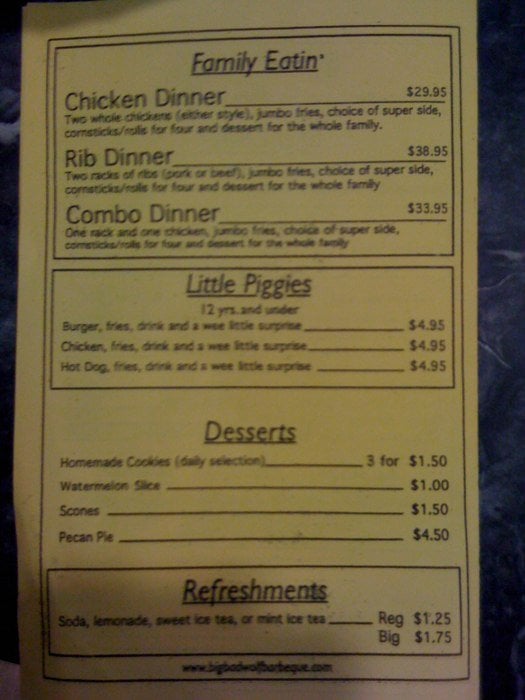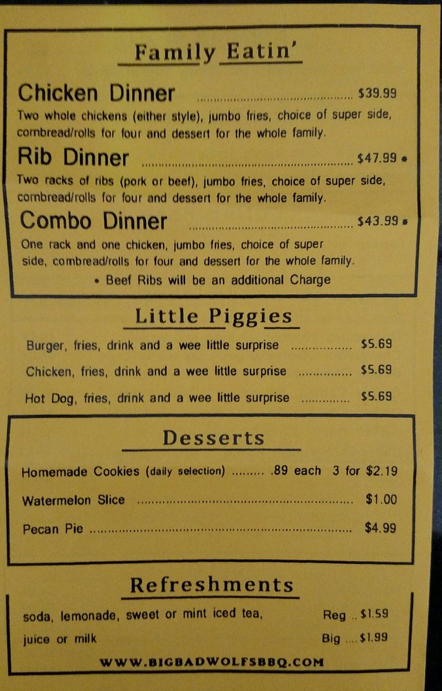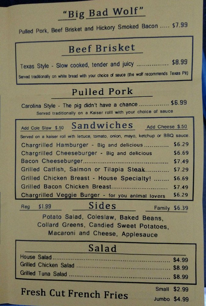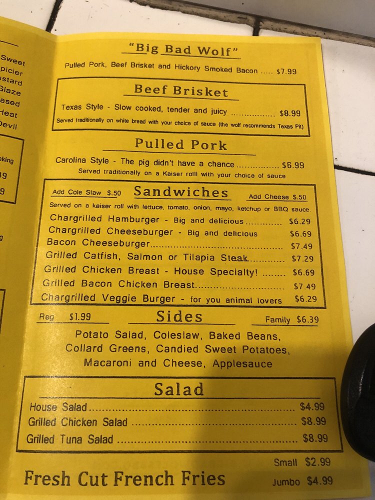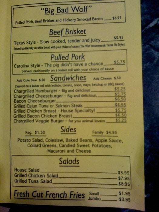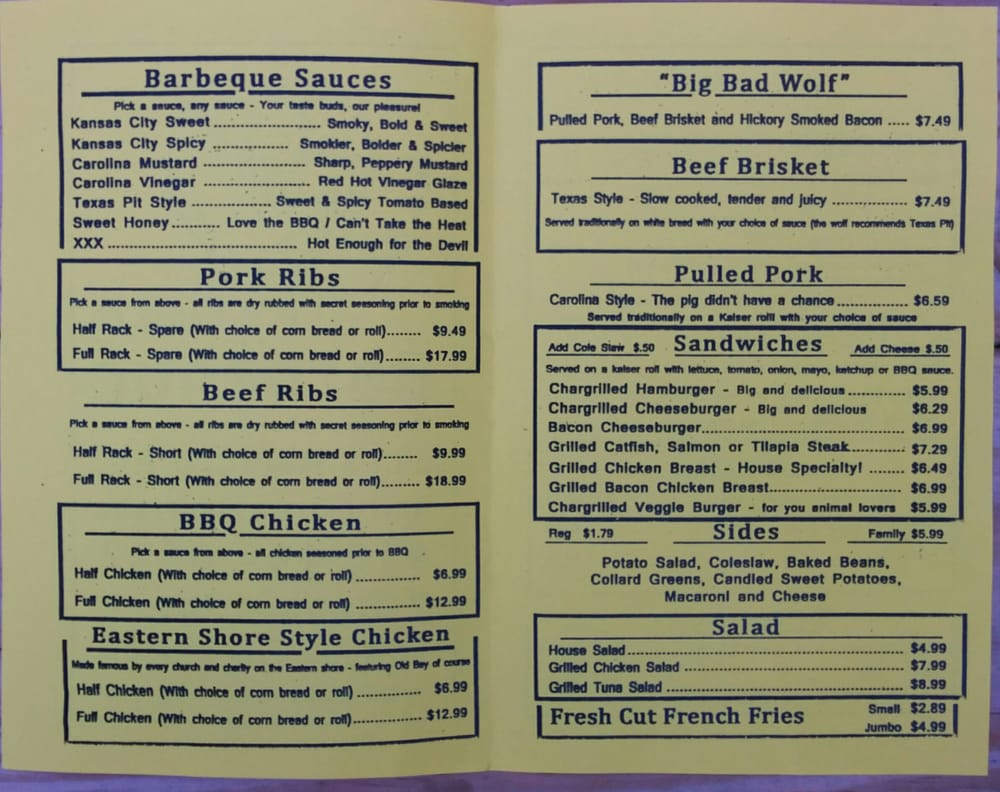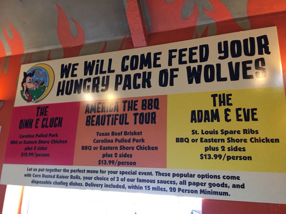 Big Bad Wolf’s House of Barbecue is a divey yet classy spot located in Baltimore, MD, offering a variety of BBQ dishes. With options for takeout, delivery, and catering, this restaurant is known for its delicious ribs, BBQ chicken, and house salads. The menu features specialties like the "Big Bad Wolf" sandwich filled with barbecue, brisket, and bacon, as well as Texas-style slow-cooked meats. Customers rave about the friendly staff and fantastic flavors, with one reviewer calling it "REAL BBQ." The beef ribs are highlighted as a must-try, with a taste reminiscent of Texas BBQ. If you're a BBQ enthusiast looking for an authentic and mouthwatering experience, Big Bad Wolf’s House of Barbecue is a hidden gem worth exploring.